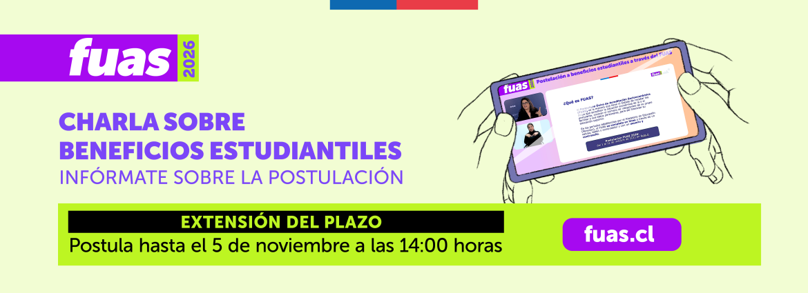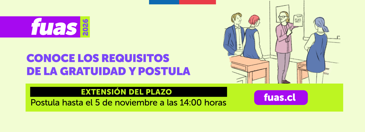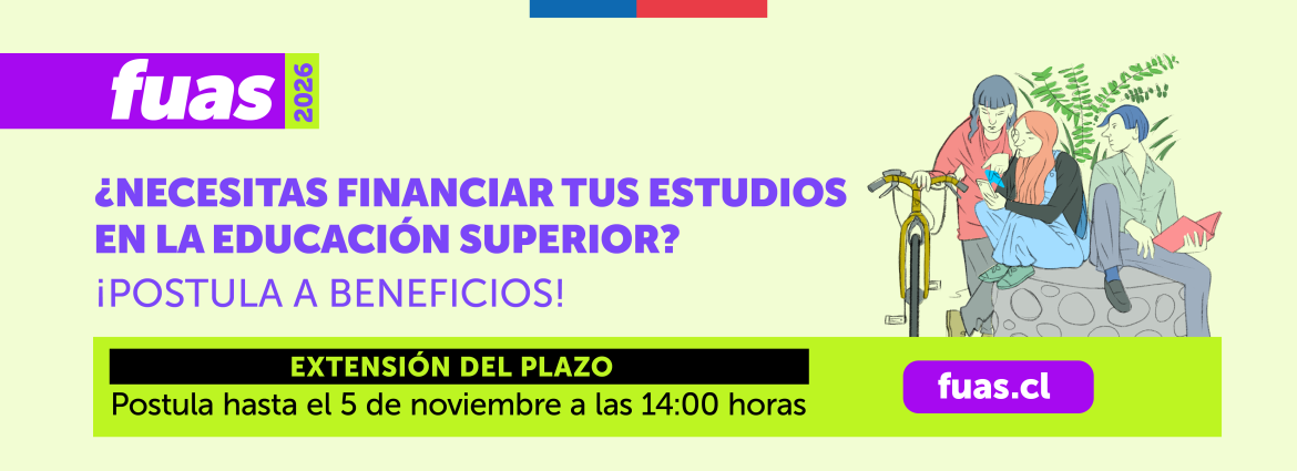 - PostulaciónEntre el miércoles 1 y el miércoles 22 de octubre de 2025 se abrirá el primer periodo de postulación a beneficios estatales para educación superior, mediante el Formulario Único de Acreditación Socioeconómica (FUAS).